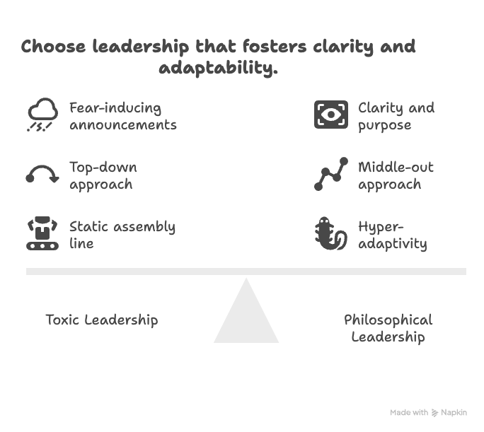 Toxic vs. Philosophical Leadership: Toxic leadership announces fear-inducing job cuts without clarity ("slash 12,000 jobs because of AI"). Helpful leadership, conversely, develops a philosophical stance—asking why the company is doing AI (e.g., to improve customer experience, grow the company, or preserve relationships).